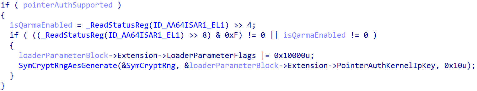 PAC enablement on Windows begins at the entry point of ntoskrnl.exe, KiSystemStartup. KiSystemStartup is responsible for determining if PAC is supported on Windows and also for initializing basic PAC support. KiSystemStartup receives the loader parameter block (LOADER_PARAMETER_BLOCK) from winload.efi, the Windows boot loader. The loader block denotes if PAC is supported. Specifically, the loader parameter block extension (LOADER_PARAMETER_EXTENSION) portion of the loader block defines a bitmask of various features which are present/supported, so say the boot loader. The PointerAuthKernelIpEnabled bit of this bitmask denotes if PAC is supported. If PAC is supported, the loader parameter block extension is also responsible for providing the initial PAC signing key (PointerAuthKernelIpKey) used to sign and authenticate all kernel-mode pointers (we will see later that the “current” signing key is updated many times). When execution is occurring in kernel-mode, this is the key used to sign kernel-mode pointers. The bootloader generates the key in OslPrepareTarget by calling the function SymCryptRngAesGenerate to generate the initial kernel pointer signing key passed via the loader parameter block.