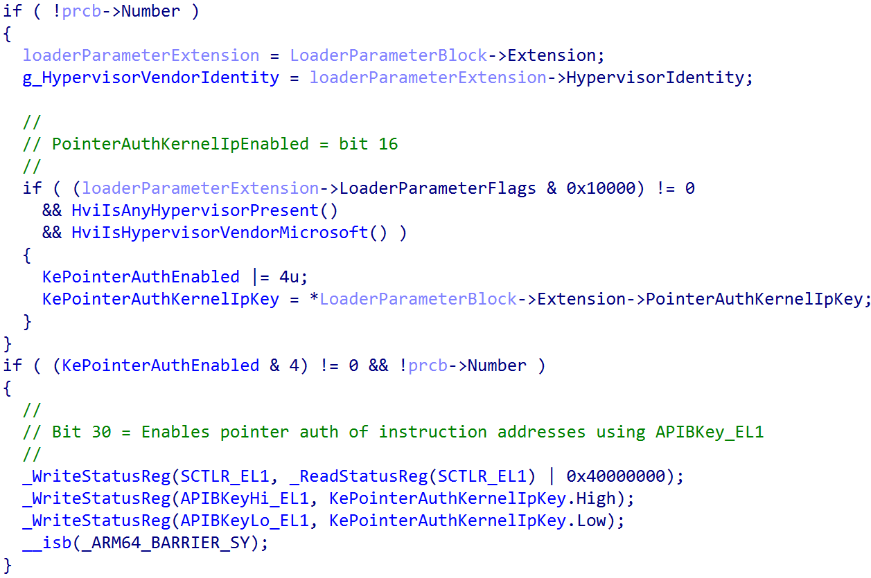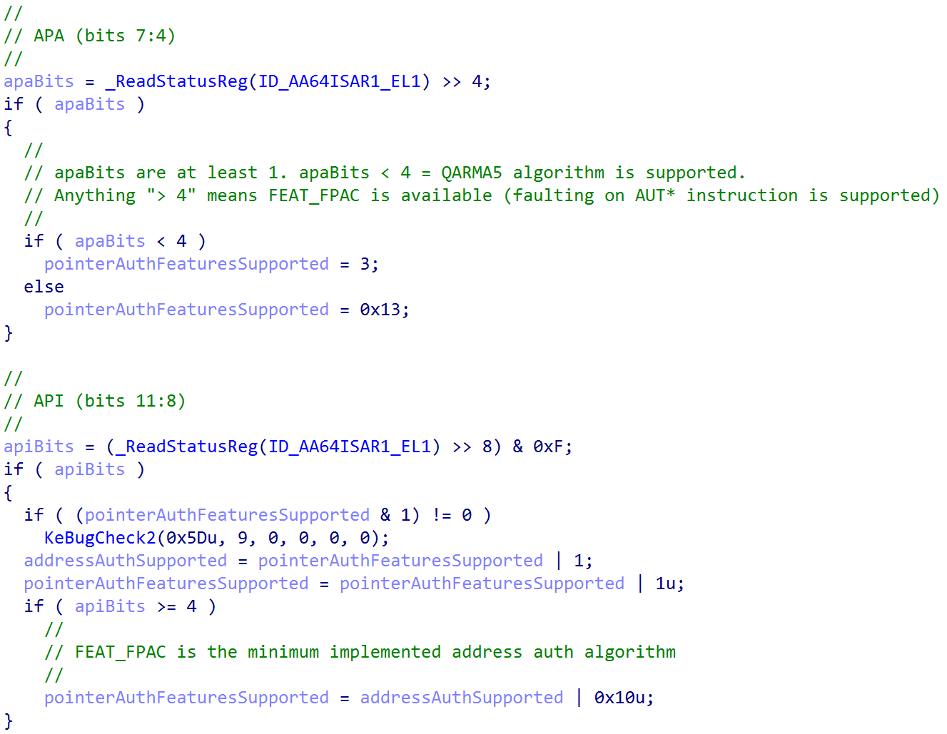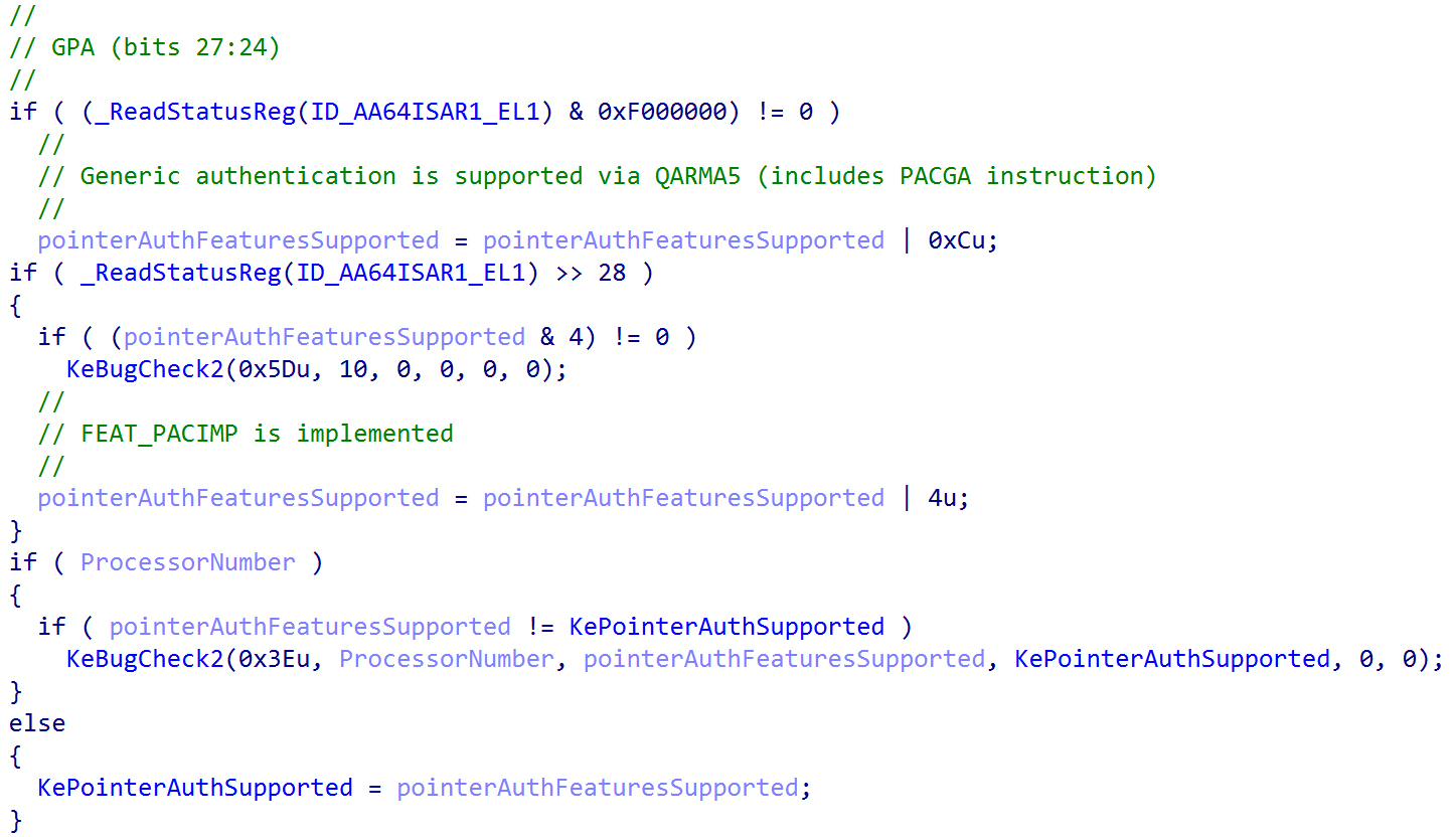After the initial signing key value has been configured, the kernel continues executing its entry point in order to continue to fill out some of the basic functionality of the kernel (although the kernel is not done yet being fully initialized). Almost immediately after performing basic PAC initialization, the function KiInitializeBootStructures is called from the kernel entry point, which also receives the loader parameter block and initializes various items such as the feature settings bitmask, setting the proper stack sizes (especially for “special” stacks like ISR stacks and DPC stacks), etc. One of those crucial things that this function does is call into KiDetectPointerAuthSupport, which is responsible for the bulk of the PAC initialization. This function is responsible for reading from the appropriate PAC-related ARM system registers in order to determine what specific PAC features the current CPU is capable of supporting.