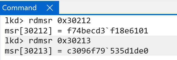 It is possible to examine the current signing key values using WinDbg. Although WinDbg, on ARM systems, has no extension to read from these system registers, it was discovered through trial-and-error that it is possible to leverage the rdmsr command in WinDbg to read from ARM system registers using the encoding values provided by the ARM documentation. The two PAC key system registers used by Windows have the following encodings: