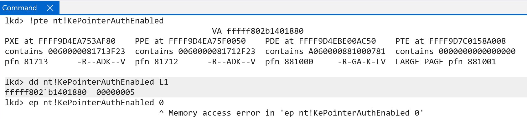 Note that the “enablement” flags are not directly tied one-to-one to the “supported flags”. As previously seen, KePointerAuthEnabled is masked with the value 4 in KiSystemStartup before the “supported” options are even evaluated. Additionally, note that the KePointerAuthEnabled variable is marked as read-only and is present in the CFGRO section, which is also read-only in the VTL 0 guest page tables (known in ARM as the “Stage 2 tables” with “Stage 2” tables being the final level of translation from guest memory to system memory) thanks to the services of Hypervisor-Protected Code Integrity (HVCI), along with KePointerAuthKernelIpKey and KePointerAuthMask. As seen below, even using WinDbg, it is impossible to overwrite these global variables as they are read-only in the “Stage 2” page tables.