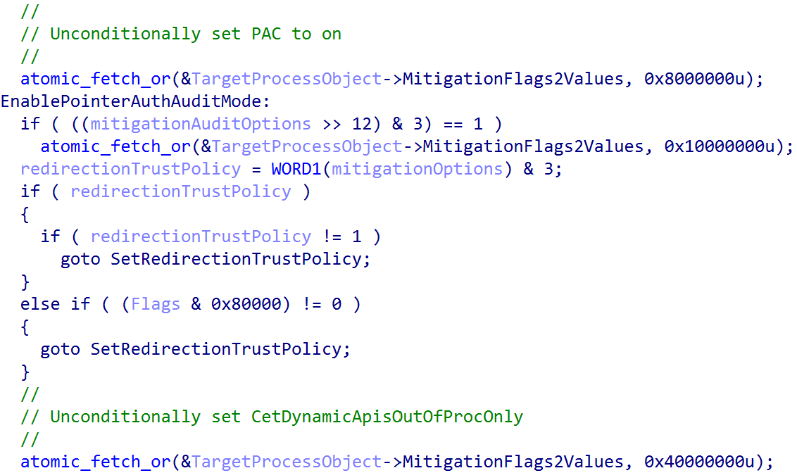 However, testing and reverse engineering revealed that PAC is unconditionally enabled on user-mode processes (as shown above) with no way to disable the mitigation either at process creation (e.g., creating a child process with extended parameters) or by calling SetProcessMitigationPolicy at runtime. The only other supported way to enable a process mitigation at process creation is to use the ImageFileExecutionOptions (IFEO) registry key. This functionality is wrapped by the “Exploit Protection” UI on Windows systems, but the registry value can be set manually. Unfortunately, there is no PAC Exploit Protection setting in the UI.