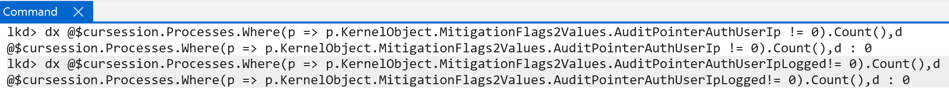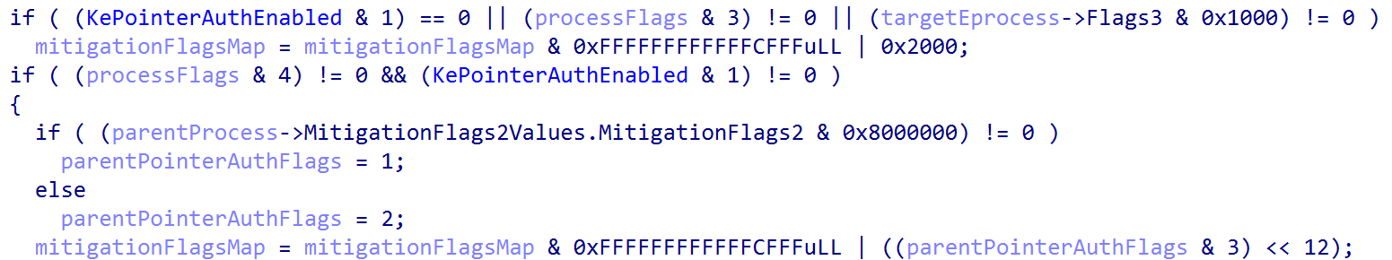 Outside of the exploit mitigation policy for PAC, there is also an audit-mode exploit mitigation policy option in the ImageFileExecutionOptions policy map. This can be confirmed through the presence of the mitigation flag values of AuditPointerAuthUserIp and AuditPointerAuthUserIpLogged in the MitigationFlags2Values field of a process object on Windows.