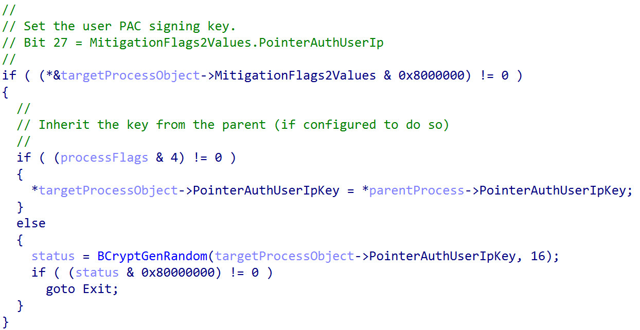 Once the appropriate PAC-related initialization flags have been set, PAC is then enabled on a per-process basis (if per-process PAC is supported, which currently on Windows it is). For user-mode PAC, the enablement process begins at process creation, specifically during the allocation of the new process object. If PAC is enabled, each user-mode process (meaning EPROCESS->Flags3.SystemProcess is not set) is unconditionally opted-in to PAC (as all kernel-mode code shares a global signing key).