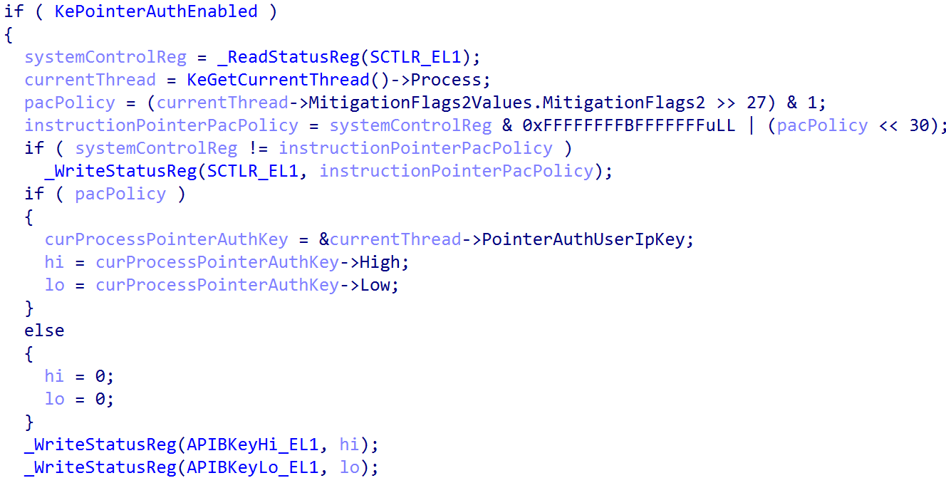 The “per-process” signing key differs from the initial (kernel) signing key that was configured in KiSystemStartup. This is because, obviously, execution is in kernel mode when the initial signing key is instantiated. However, the implementation of PAC on Windows (as we can see above) instruments a per-process signing key (along with a single kernel key). When execution transitions into user mode, the signing key system register(s) are updated to the current process signing key (which is maintained through a process object). The example below outlines the current PAC signing key being updated to that of a user-mode process, specifically when a return into user-mode happens after a system call is handled by the kernel (KiSystemServiceExit).