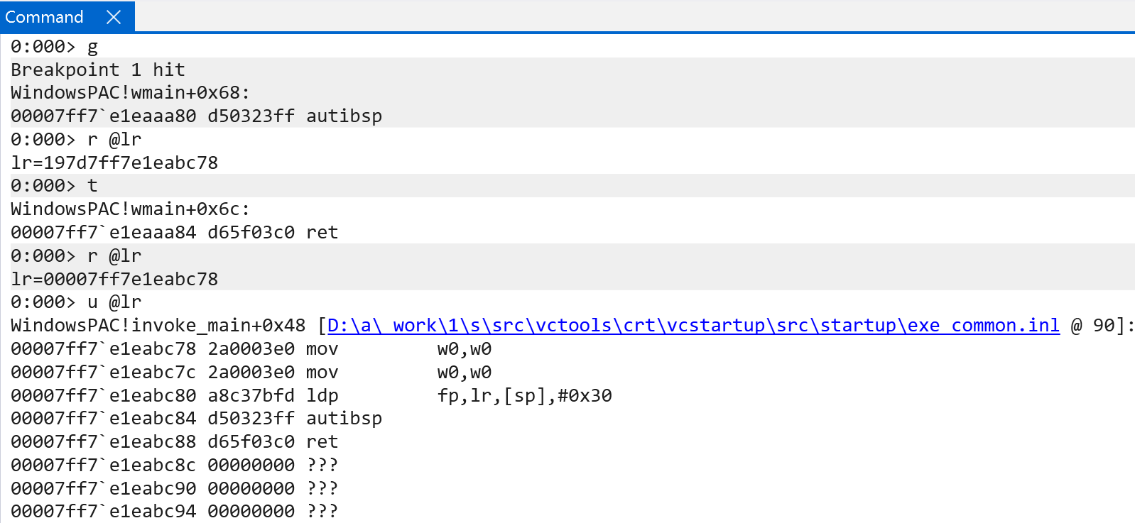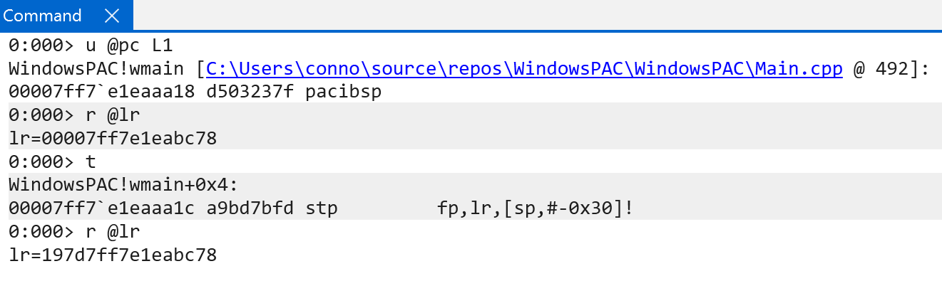 Windows currently offers an implementation of PAC (with the ability to expand in the future). Windows currently supports PAC for signing and authenticating “instruction pointers”. The way that this manifests itself, however, really results in the signing of return addresses. On Windows, for both user-mode and kernel-mode ARM64 code, one can specify the /guard:signret(-) compiler flag to either explicitly enable or disable the signing of return addresses. Enabling this flag instruments the pacibsp and autibsp instructions into the prologue and epilogue of each function, which are “PAC” instructions used to both sign and subsequently validate return addresses.