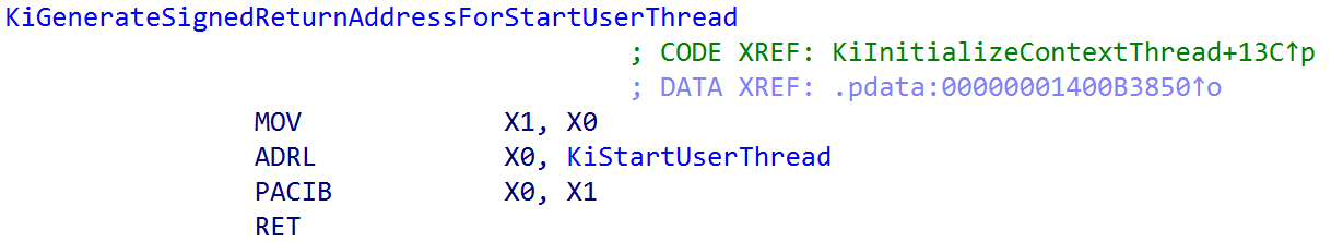 This assumes, however, that there is already a return address to process. What if a user-mode thread, for example, is just entering its initial execution, and there is no return address? Windows has two functions (for user-mode and kernel-mode) that will generate the necessary “first” signed return address via KiGenerateSignedReturnAddressForStartUserThread. These functions accept the initial stack value as the value to use in the signing of the return address, using instead the pacib instruction, which is capable of using a general-purpose architectural register in the signing process instead of just defaulting to “the current stack pointer”.