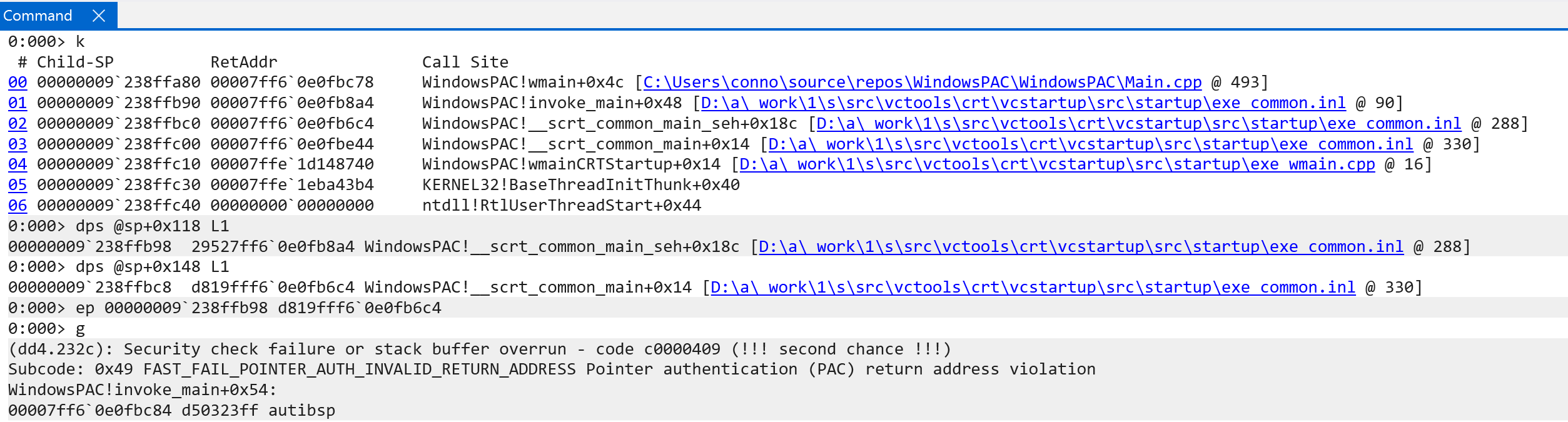 The effectiveness of PAC, however, relies on what happens if a return address has been corrupted with a malicious return address, like a ROP gadget or the corruption of a return address through a stack-based buffer overflow. In the example below, this is outlined by corrupting a return address on the stack with another return address on the stack. Both of these addresses used in this memory corruption example are signed, but, as we can recall from earlier, return addresses are signed with the considerations of the current in-scope stack pointer (meaning they are tied to a stack frame). Because the corrupted return address does not correspond to an “in-scope” stack frame, the authentication of the in-scope return address (which has been corrupted) results in a fastfail with the code FAST_FAIL_POINTER_AUTH_INVALID_RETURN_ADDRESS – and the application crashes. One interesting note, as you can see, is that WinDbg can convert a signed return address on the stack to its actual unsigned value (and appropriate symbol name).