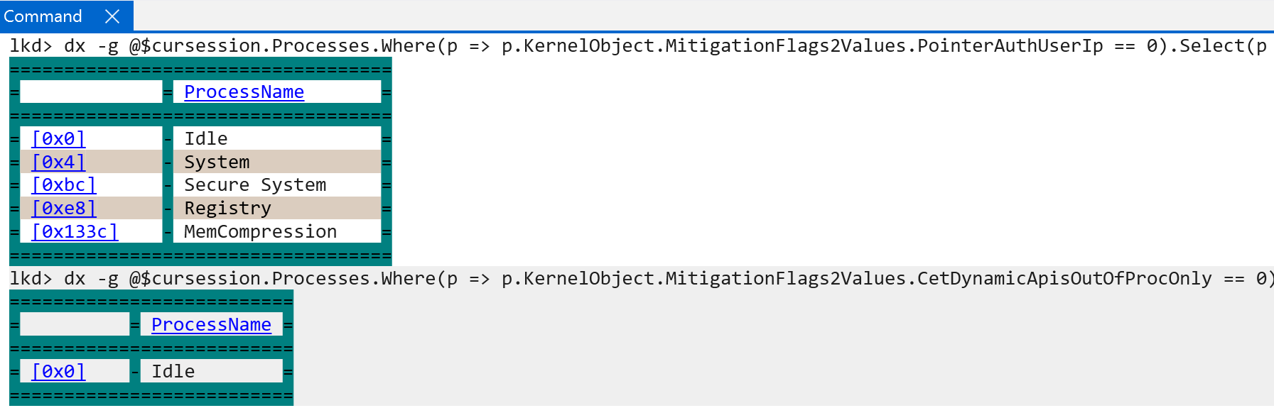 Additionally, likely as a side effect of Intel CET enablement on x86-based installations of Windows, the mitigation value CetDynamicApisOutOfProcOnly is also set unconditionally for every process except for the Idle process on Windows.