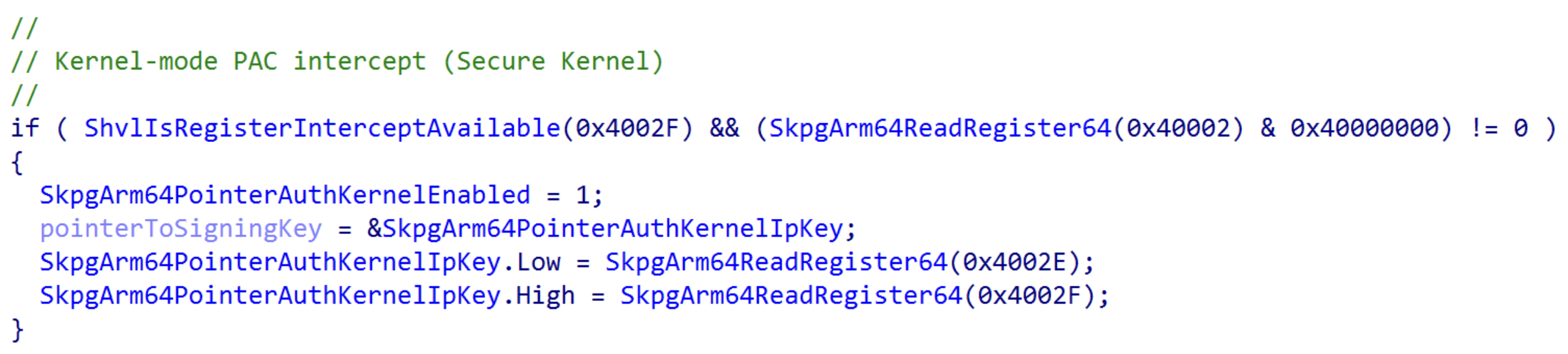 HyperGuard uses what is known as extents, which are definitions of what components/code/data/etc. should be protected by HyperGuard. On ARM64 installations of Windows, an ARM64-specific HyperGuard extent exists – the PAC system register extent. This extent is used by HyperGuard to ask the hypervisor to intercept certain items of interest – such as modifications to an MSR (or ARM64 system register), certain memory access operations, etc. Specifically for the ARM64 version of the Secure Kernel, an extent is registered for monitoring modifications to the PAC key system registers. This is done in securekernel!SkpgxInitializeInterceptMasks.